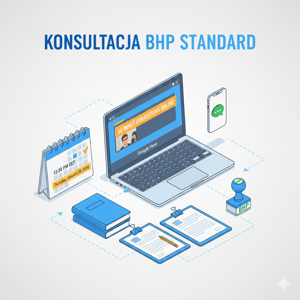 📅 TRYB PLANOWANY. 60 minut profesjonalnej konsultacji online z ekspertem BHP. Idealne rozwiązanie do analizy dokumentacji, przygotowania do kontroli PIP i doradztwa prawnego. Wybierz dogodny termin w kalendarzu zaraz po zakupie.